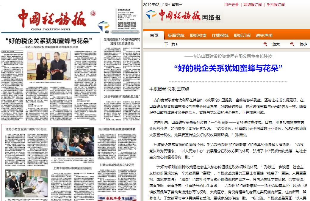 这两年来,山西建投董事长孙波有了一个新身份——义务税收宣传员。日前,刚加入完省里有关集会的孙波,如约接受了本报记者采访。“这次集会,另有前几天全国建筑行业集会,我都积极地跟各人宣传税收,尤其要宣传这么好的税收营商情况。”孙波说。