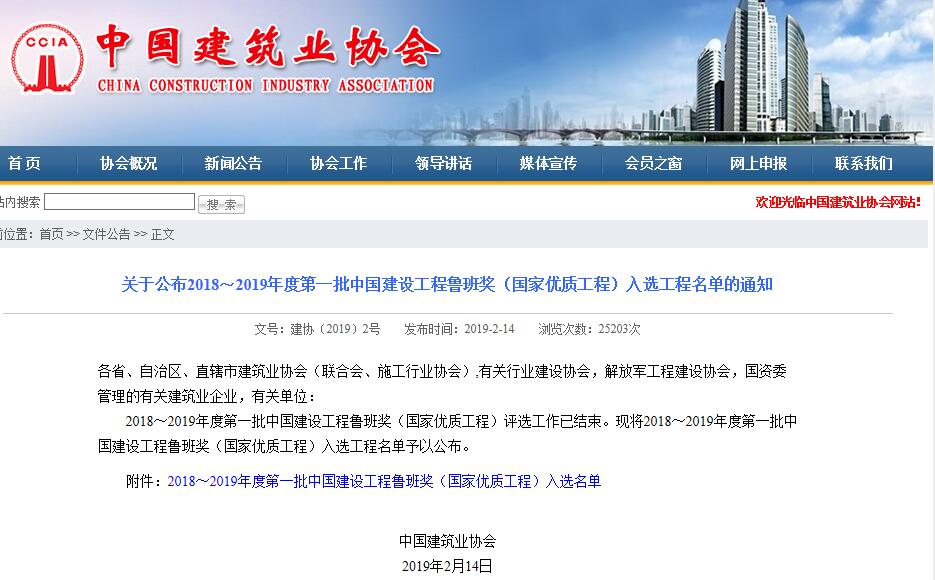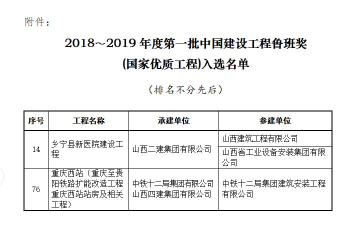 2月14日,中国建筑业协会宣布了2018~2019年度第一批中国新宝会工程鲁班奖(国家优质工程)入选工程名单,由山西建投二建集团承建、建工集团、装置集团参建的乡宁县新医院新宝会工程,四建集团与中铁十二局配合承建的重庆西站(重庆至贵阳铁路扩能革新工程重庆西站站房及相关工程)入选。