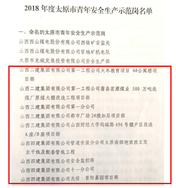 近日,共青团太原市委、太原市安监局联合下发《关于命名和认定2018年度太原市青年宁静生产示范岗的决定》,山西建投31个集体喜获“2018年度太原市青年宁静生产示范岗” 。