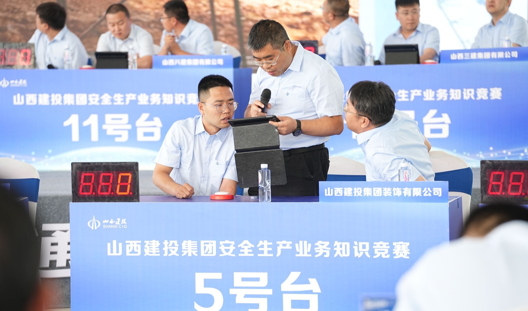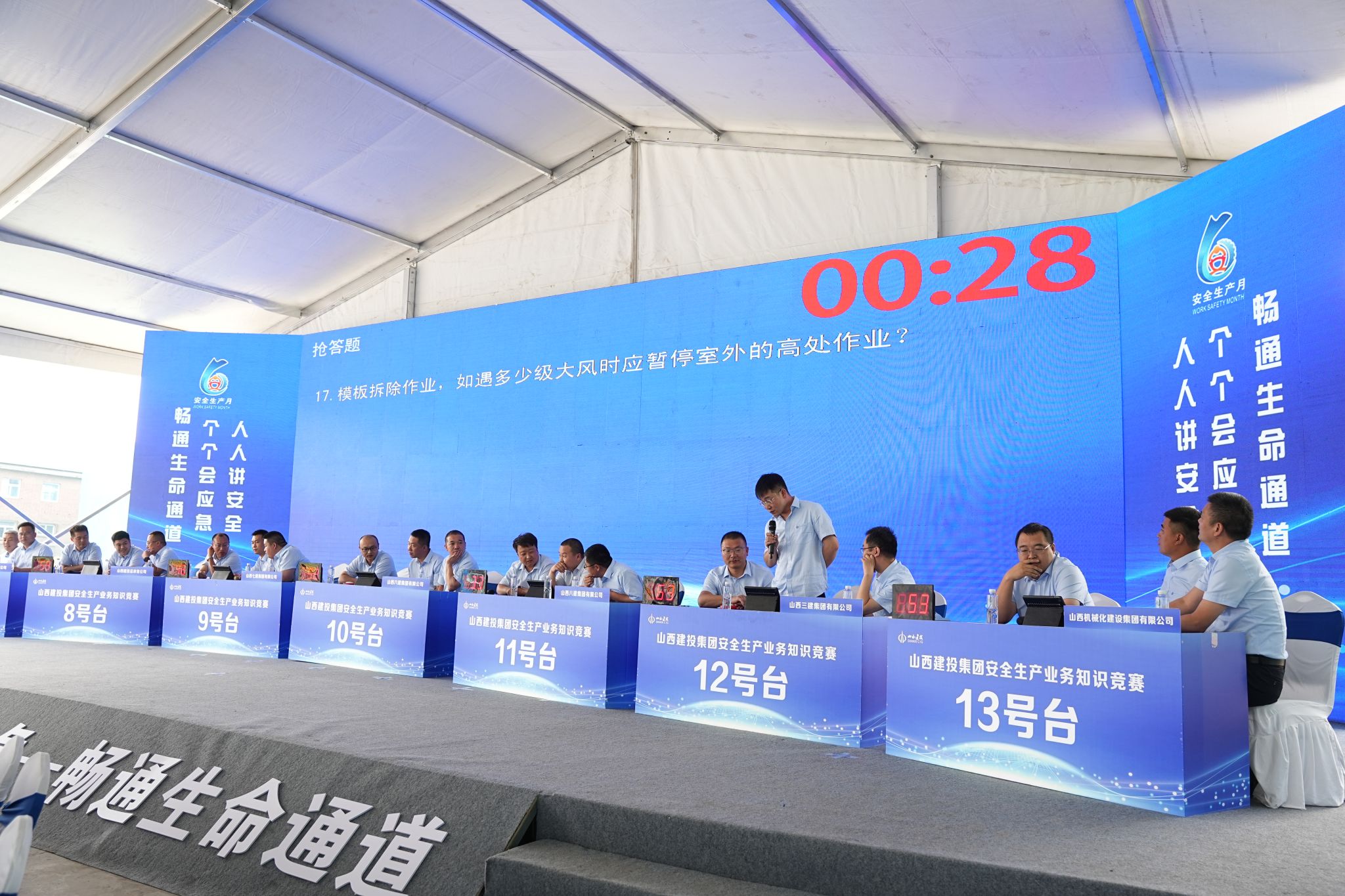 实践练习,宁静入心。技术实操竞赛中,13支各由1名分公司经理、1名项目经理、1名项目专职宁静员组成的企业代表队,在危害识别、班前教育和业务知识抢答三个角逐环节中展开精彩角逐。竞赛内容涵盖施工现场应知应会的基坑、脚手架、机械设备、高处作业、动火作业等危大工程、危险作业知识,充分考验了选手们的宁静知识储备量及应对种种宁静问题的思辨能力。