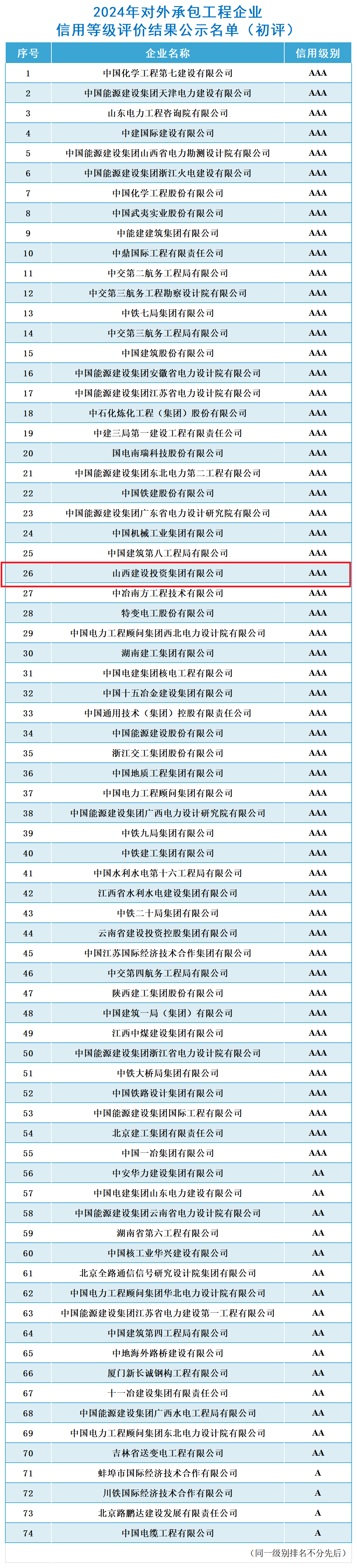 近日,2024年中国对外承包工程商会企业信用品级评价结果宣布,山西建投集团顺利通过对外承包工程AAA级信用企业初评(期满重评),连续第七年被评为最高信用品级AAA级企业。