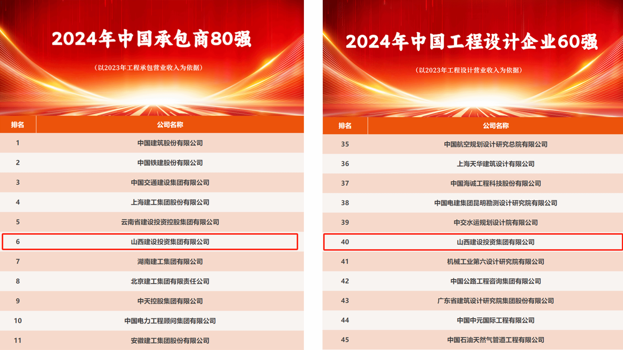 12月9日,美国《工程新闻纪录》(ENR)和中国《建筑时报》配合宣布了2024年度中国承包商80强和工程设计企业60强榜单,山西建投集团位列中国承包商80强第6名,较2023年上升1位;工程设计企业60强第40名。