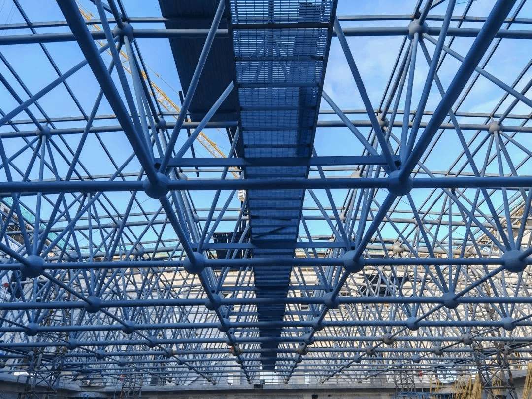 应县全民健身中心项目总投资2.79亿元,位于应县长征路,总建筑面积为2.97万平方米。该项目屋面球形钢网架工程最大跨度75.6米,主要由球节点、杆件、檩托、网架支座等组成,接纳了16种圆管、17种焊接球,升顶高度为18.5米,总重量达314.35吨,属于超危大工程。