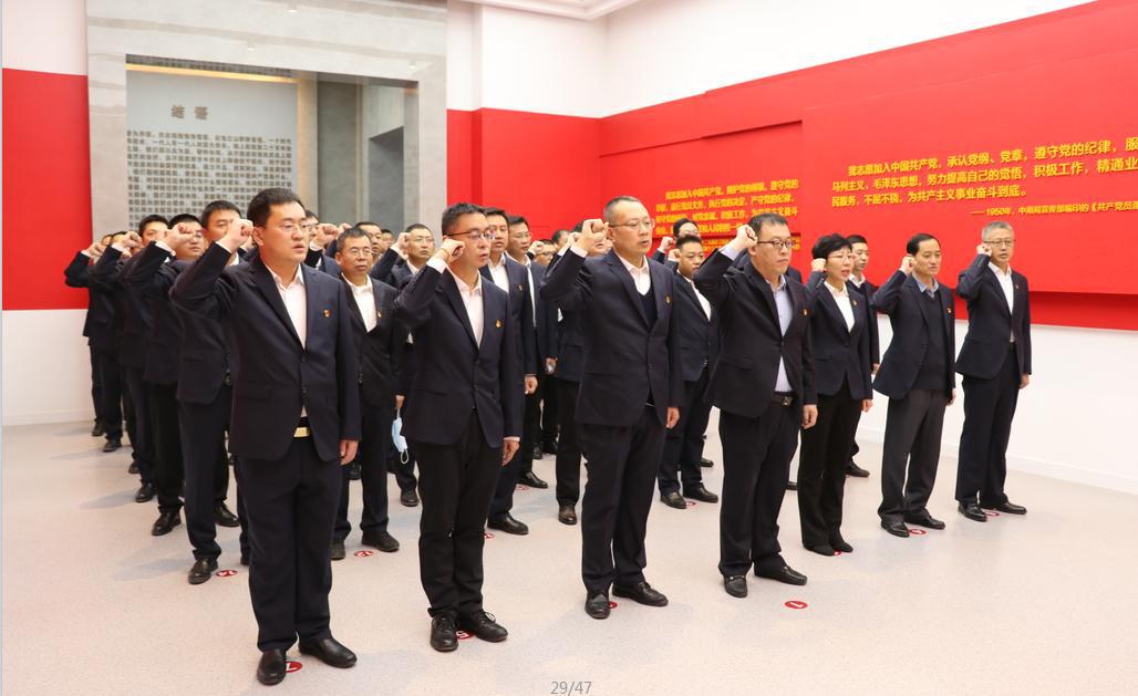 在讲解员的引导下,全体人员走进“牢记初心使命”党风廉政教育大型主题展,依次旅行“时代叩问、初心如磐”“利剑高悬、知畏知止”“崇德修身、治本之道”等展区,重温党的百年斗争和自我革命历程,深刻认识习近平总书记关于全面从严治党战略目标的重要论述。随后,面向鲜红的中国共产党党旗,观展同志举起右拳,重温入党誓词,铿锵有力的宣誓声响彻大厅。