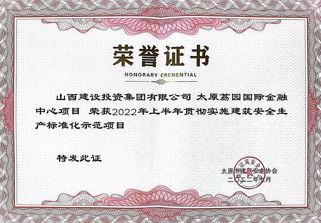 近年来,总承包公司深入开展建筑宁静生产标准化事情,狠抓宁静基础治理和宁静生产标准化新宝会,积极探索宁静治理新途径新要领,注重从业人员素质提升,努力构建宁静生产长效机制。通过连续革新,公司宁静生产包管体系日渐完善,宁静生产水平日益提升,宁静生产形势连续稳定,宁静生产事情迈上了新台阶。在获得国奖的同时,太原荔园国际金融中心项目,也荣获了太原市建筑宁静协会2022年上半年贯彻实施建筑宁静生产标准化示范项目。