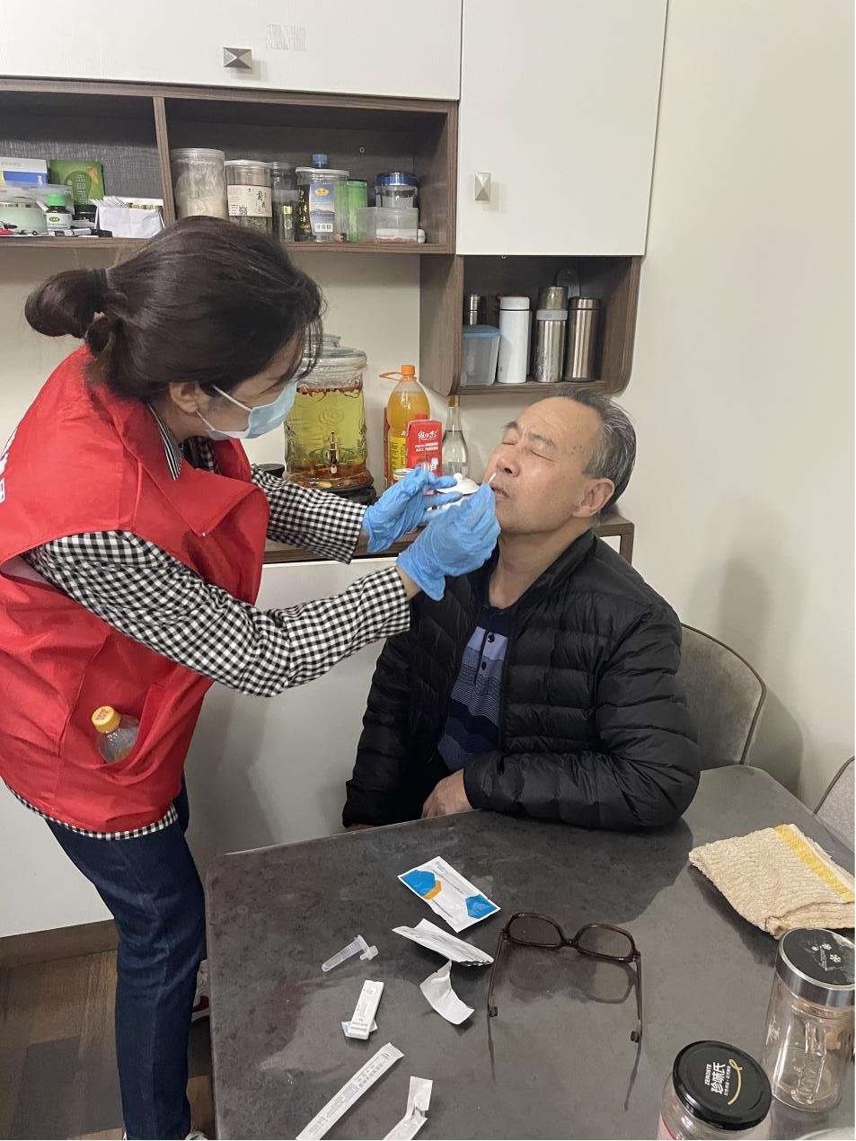 (志愿者协助社区事情人员为居民发放自测新冠抗原试剂盒 ,资助老人幼儿检测 ,确保不漏一户一人。)