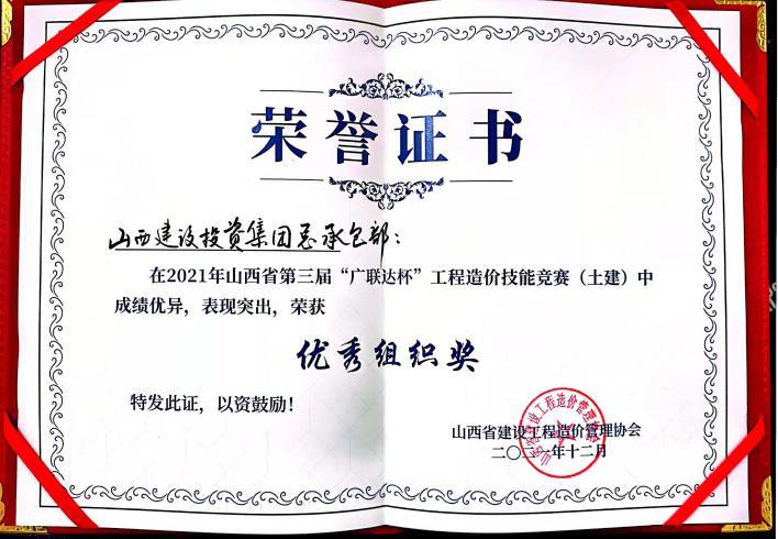 12月18日,由山西省新宝会工程造价治理协会主办的2021年山西省第三届“广联达杯”工程造价技术竞赛决赛在山西饭店举行。公司荣获装置专业组“团体一等奖”和“团体优秀组织奖”两项荣誉。