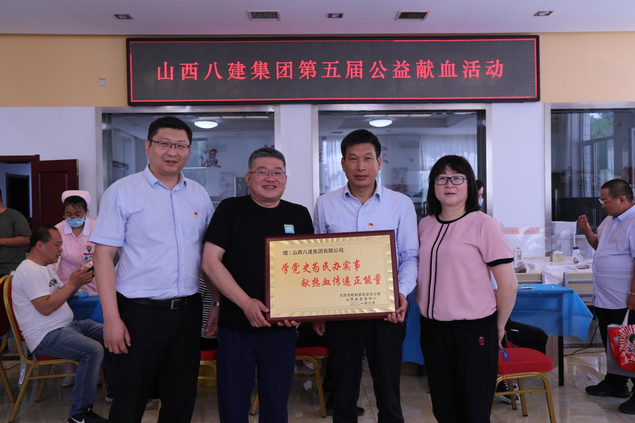 太原市血液中心副主任周源向八建集团多年来对无偿献血公益事业的大力支持和献血志愿者们的无私贡献体现由衷赞赏和衷心谢谢,将题有“学党史为民办实事,献热血通报正能量”的牌匾赠予集团。