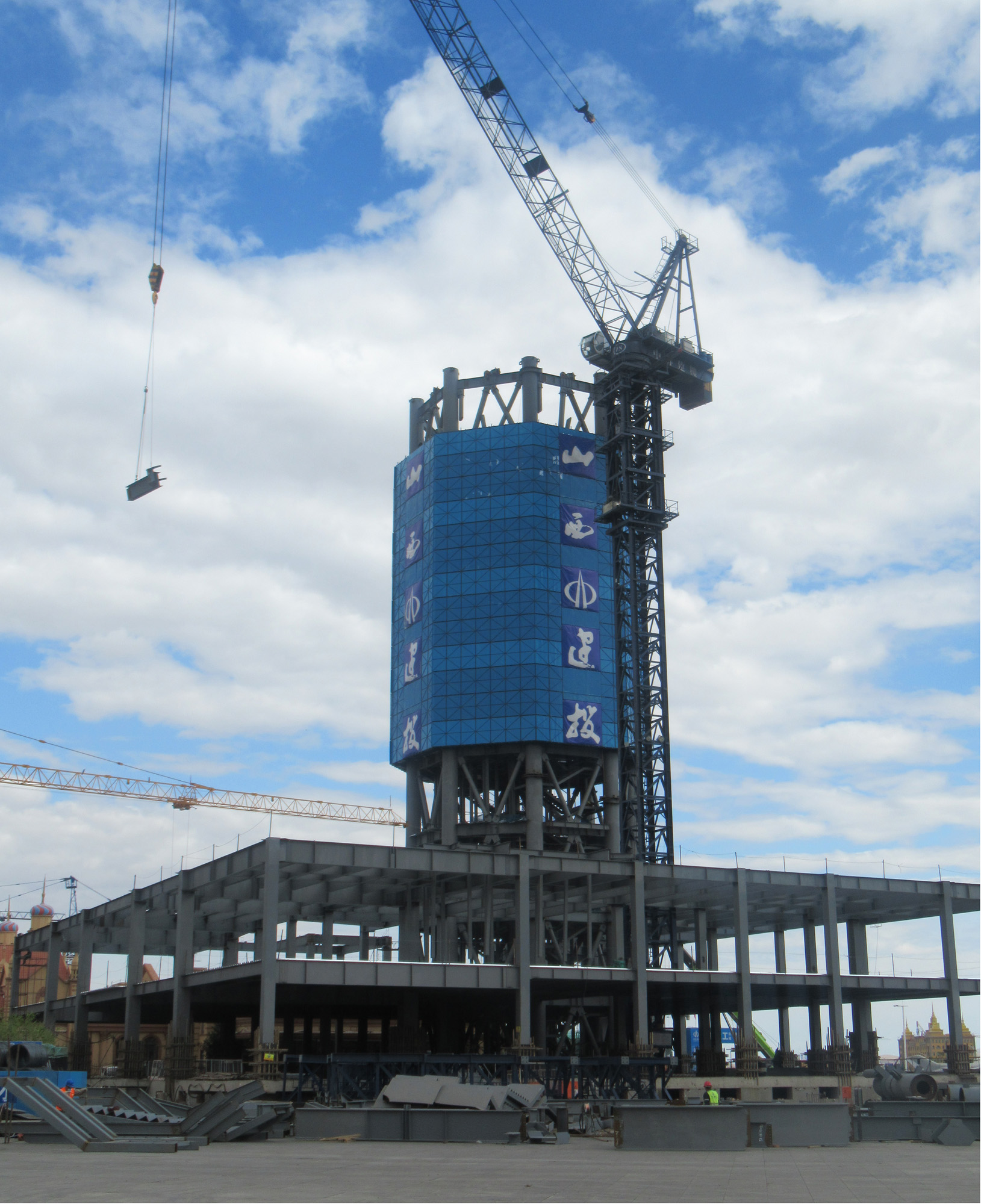 在中俄疆域内蒙古满洲里市 ,百余名建工人日夜奋战 ,一座超高层钢结构地标性建筑正在拔地而起 。
