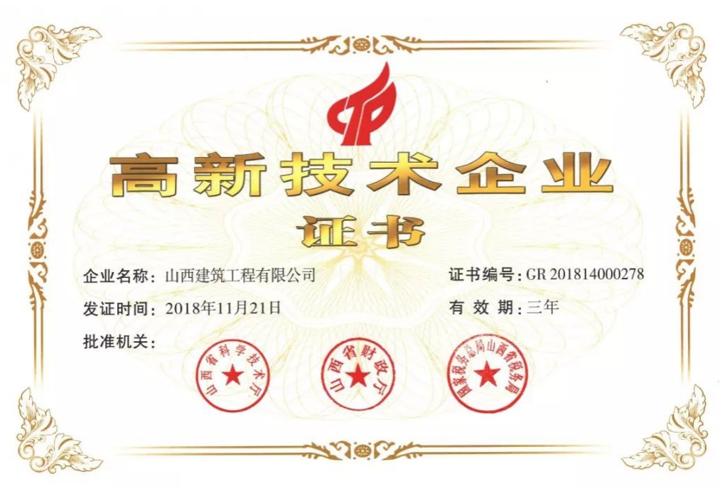 近日,山西建投建工集团荣获山西省科技厅、山西省财务厅、国家税务总局山西省税务局联合下发的《国家高新技术企业证书》。