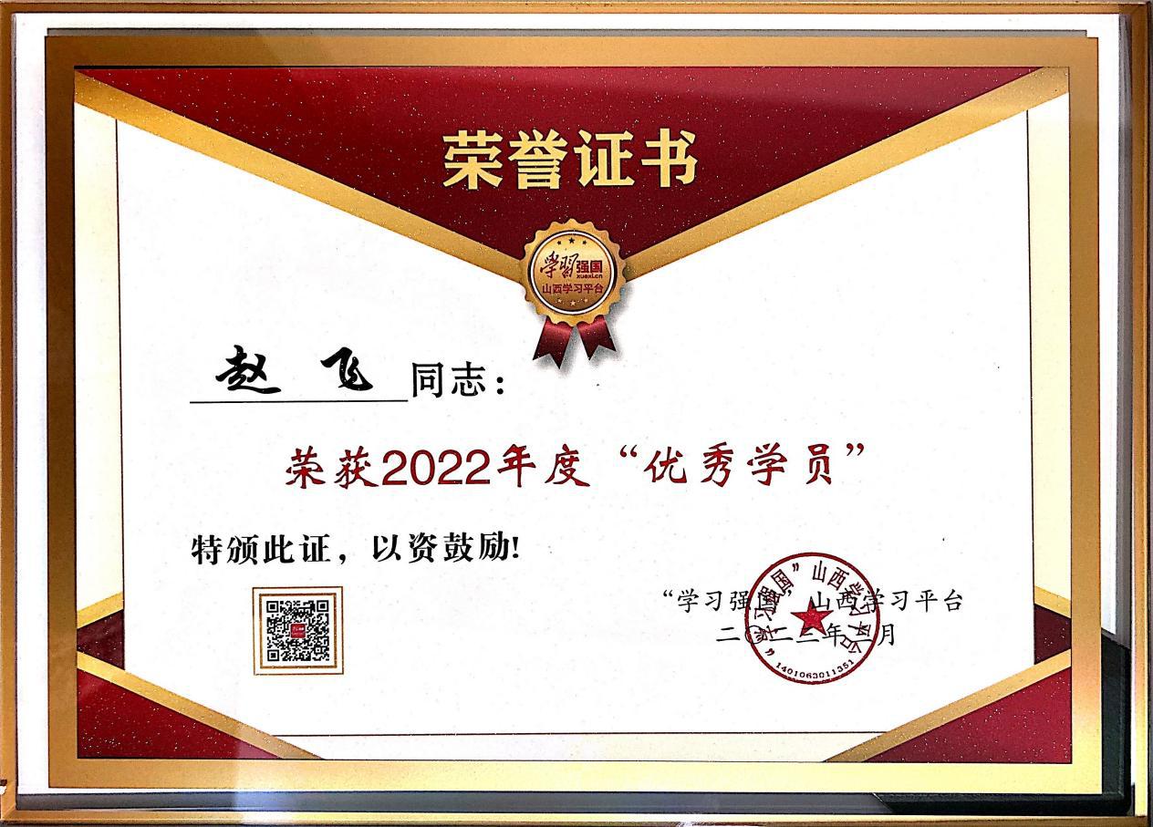 在2022年度“学习强国”山西学习之星、强国志愿之星、优秀事情者、模范组织评选运动中,集团职工赵飞荣获山西学习平台优秀学员称呼 。
