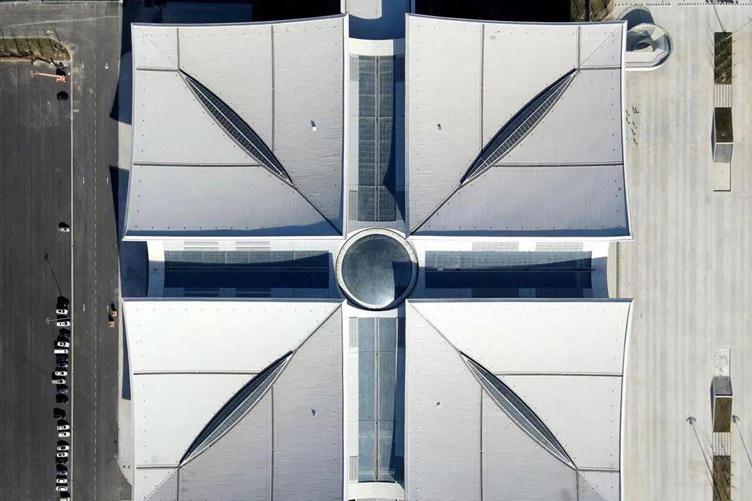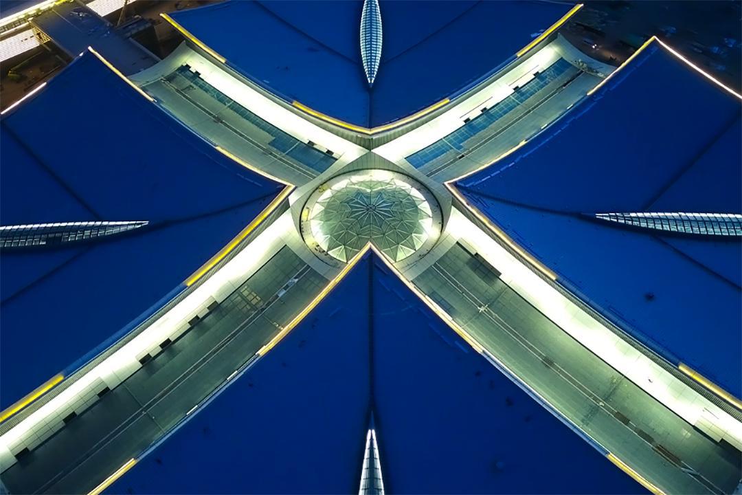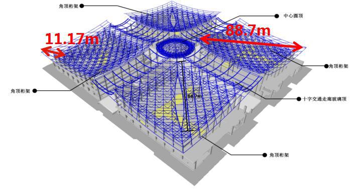 项目总体工程量大、施工面积大、高空作业量较大,桁架拼装施工阶段工期紧张、施工周期短,钢结构工程施工工艺庞大,施工历程中与土建专业、围护结构施工交叉作业较为频繁。屋盖结构是该项目最为庞大部分,属于非连续的大跨度正交斜放空间管桁架结构,分四个角顶、十字交通走廊玻璃顶、中心圆顶三部分,四个角顶每个投影面积约6400平方米,重量1000余吨,最大跨度88.7米,最大高空作业高度约36米,为典范的超高峻跨度施工。桁架结构中,各个角顶均为非对称桁架、四边不等高造型,杆件数量多达2万根,其中单个节点最多需将14根杆件交汇焊接,制作、施工难度系数高。