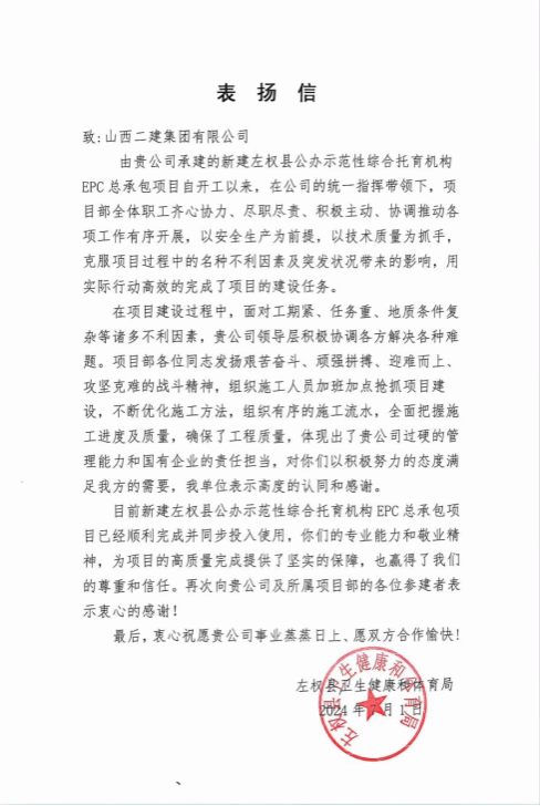 н¨×óÈ¨ÏØ¹«°ìʾ·¶ÐÔ×ÛºÏÍÐÓý»ú¹¹EPC×ܳаüÏîÄ¿ÊÕµ½ÏØÎ¯ÏØÕþ¸®×óÈ¨ÏØÎÀÉú½¡¿µºÍÌåÓý¾Ö·¢À´µÄ±íÑïÐÅ¡£ÐÅÖÐÖ¸³ö £¬¶þ½¨¼¯ÍŸ߶ÈÖØÊÓ¡¢Í³Ò»Ð­µ÷¡¢Æë×¥¹²¹Ü £¬ÏîÄ¿ÍŶÓÔÚÏîĿᦻáÀú³ÌÖгм̡°¾«Ðľ«Æ·¡¢×¨ÐÄרע¡±µÄ½¨ÖþÀíÄî £¬È«Á¦ÒÔ¸°±¼×żȶ¨Ä¿±ê¸ß°ºÅ¬Á¦ £¬ÊµÏÖ¹¤³Ì×ÜÄ¿±ê £¬¶Ô¶þ½¨¼¯ÍŹýÓ²µÄÖÎÀíÄÜÁ¦ºÍÔðÈμÌÐøÌåÏָ߶ÈÈÏͬ¡£