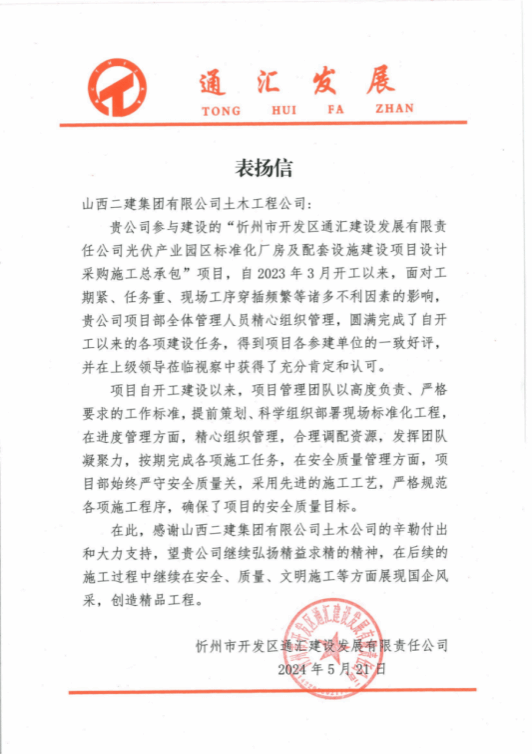½üÈÕ £¬É½Î÷½¨Í¶¶þ½¨¼¯Íųн¨µÄÒ»ÅúÖØµã¹¤³ÌÊÕµ½Ð±¦»áµ¥Î»ÒµÖ÷µÄ±íÑïÐÅ¡£Ð±¦»áµ¥Î»¶Ô¶þ½¨¼¯ÍÅ¡°ÎñʵóÆÐС¢íÆí·ܽøµÄÊÂÇé×÷·ç¡±ÌåÏָ߶ÈÈϿɺÍÔÞÉÍ¡£