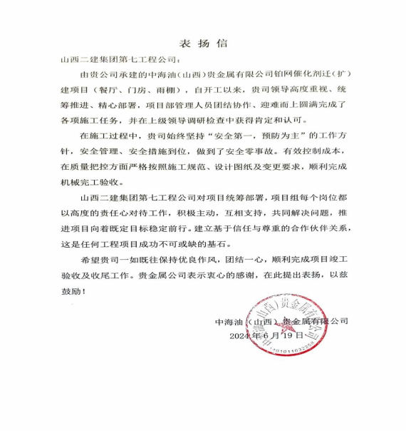 ²¬Íø´ß»¯¼ÁǨ£¨À©£©½¨ÏîÄ¿ÊÕµ½Ð±¦»áµ¥Î»Öк£ÓÍ£¨É½Î÷£©¹ó½ðÊôÓÐÏÞ¹«Ë¾·¢À´µÄ±íÑïÐÅ¡£ÐÅÖжԷֹ«Ë¾¡¢ÏîÄ¿²¿Ãæ¶ÔÊ©¹¤Í¼Ö½±ä»»´ó¡¢½»²æ×÷Òµ¶à¡¢¸Ä½¨Óëн¨½áºÏ¡¢Ê©¹¤·±ËöµÈµ¹ÔËÒòËØ £¬Í³³ï°²ÅÅ £¬¸ßЧÍê³ÉᦻáÊ©¹¤ÈÎÎñ¸øÓè¿Ï¶¨¡£