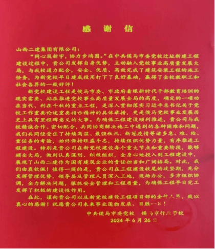 ÁÙ·Ú¹«Ë¾³Ð½¨µÄÖйú¹²²úµ³ºîÂíÊÐίµ³Ð£Ç¨Ö·Ð½¨¹¤³ÌÏîÄ¿ÊÕµ½Ð±¦»áµ¥Î»ºîÂíÊÐίµ³Ð£¼°ºîÂíÊÐÐÐÕþѧУµÄллÐÅ¡£ÐÅÖжÔÏîÄ¿µÄ¹¤³Ì½ø¶È¡¢Ê©¹¤ÖÊÁ¿ÌåÏÖ³ä·Ö¿Ï¶¨ £¬¶Ô¶þ½¨¼¯ÍÅËùչʾ³öµÄ¹úÆó¼ÌÐøÌåÏָ߶ÈÔÞÑï¡£