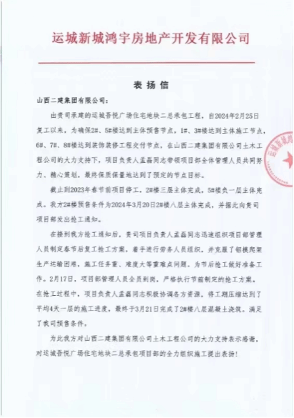 Ô˳ÇÎáÔù㳡סլµØ¿é¶þ×ܳаü¹¤³Ì1#¡¢3#¡¢5#¡¢6#¡¢7#סլÏîÄ¿ÊÕµ½Ô˳ÇгǺèÓî·¿µØ²ú¿ª·¢ÓÐÏÞ¹«Ë¾µÄ±íÑïÐÅ¡£ÐÅÖжÔÏîÄ¿²¿ÂôÁ¦ÈËÔÚÊÕµ½ÇÀ¹¤Í¨Öªºó £¬Ñ¸ËÙ×éÖ¯ÖÎÀíÈËÔ±ÖÆ¶¨¼Æ»® £¬¿Ë·þÂÁÄ£ÅÀ¼Ü´º½ÚÉú²úÔËÊäÀ§ÄÑ £¬Ê©¹¤ÈÎÎñÖØ¡¢ÄѶȴóµÈÖØÄѵãÎÊÌâÌá³ö±íÑï¡£