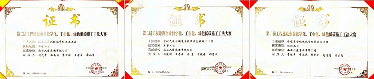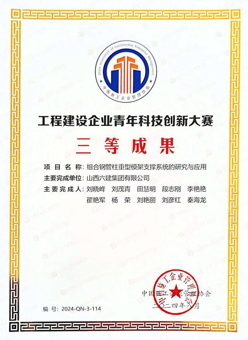 大赛结果中,山西建投六建集团申报的《一种微型顶管管道内电力排管施工要领》《一种用于弧形箱梁翼缘板的可调式模架》《一种施工现场围挡用抑尘清洁装置》划分获得工程建造微立异技术大赛二等奖、三等奖,《一种电缆施工防脱落敷设牵引装置》《一种重型模架支撑装置》《一种施工升降机用的楼层层门结构》划分获得工程新宝会行业高推广价值专利大赛三等奖和优胜奖,《双曲面异形玻璃穹顶施工工法》《装配式泡沫陶瓷自保温屋面板施工工法》《橡塑复合绝热风管装置施工工法》划分获得工程新宝会企业“数字化、工业化、绿色低碳”施工工法大赛二等奖、三等奖和优胜奖;《组合钢管柱重型模架支撑系统的研究与应用》获得首届工程新宝会企业青年科技立异大赛三等奖。