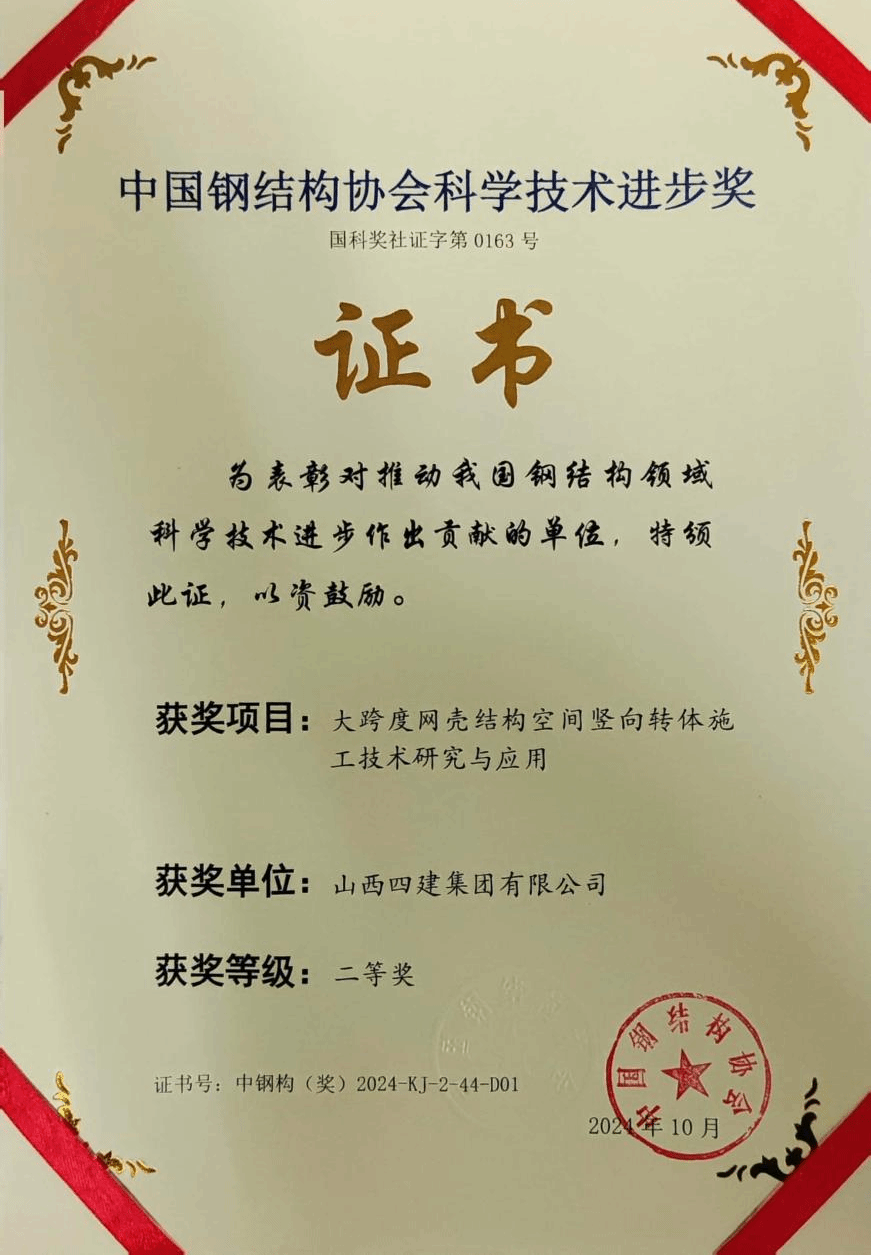 近日,中国钢结构协会建立四十周年纪念大会暨2024中国钢结构大会在北京召开,山西建投四建集团申报的《大跨度网壳结构空间竖向转体施工技术研究与应用》获评2024年中国钢结构协会科学技术进步奖二等奖。
