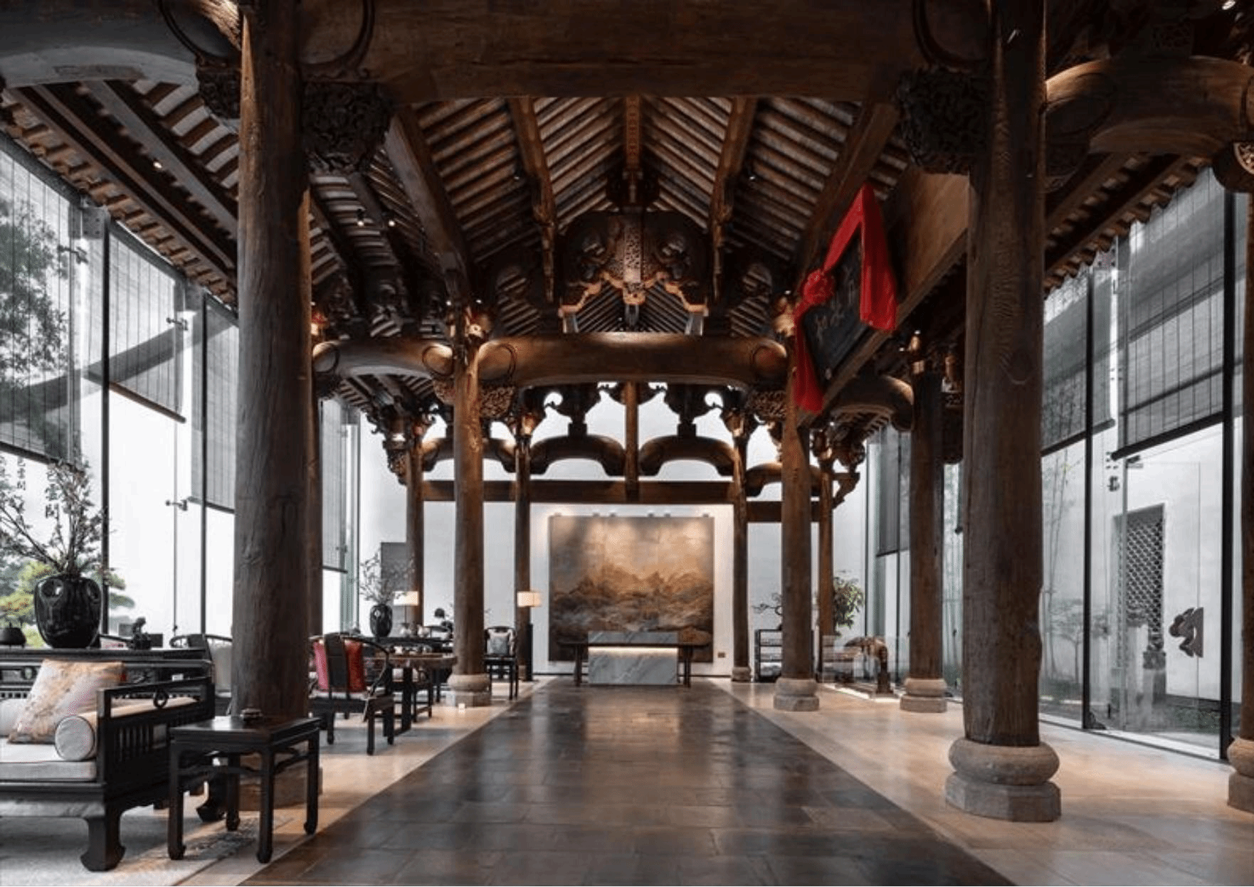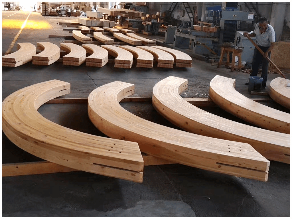 园区可生产仿古建筑柱梁、胶合木柱、胶合木梁、大跨度胶合弯梁、轻型木结构墙体、轻型木桁架、木结构连接件等7种木结构构件产品,以及木雕、砖雕、石雕等配套装饰类构件产品,具有重量轻、施工快、抗震性能好、舒适、美观等优点。