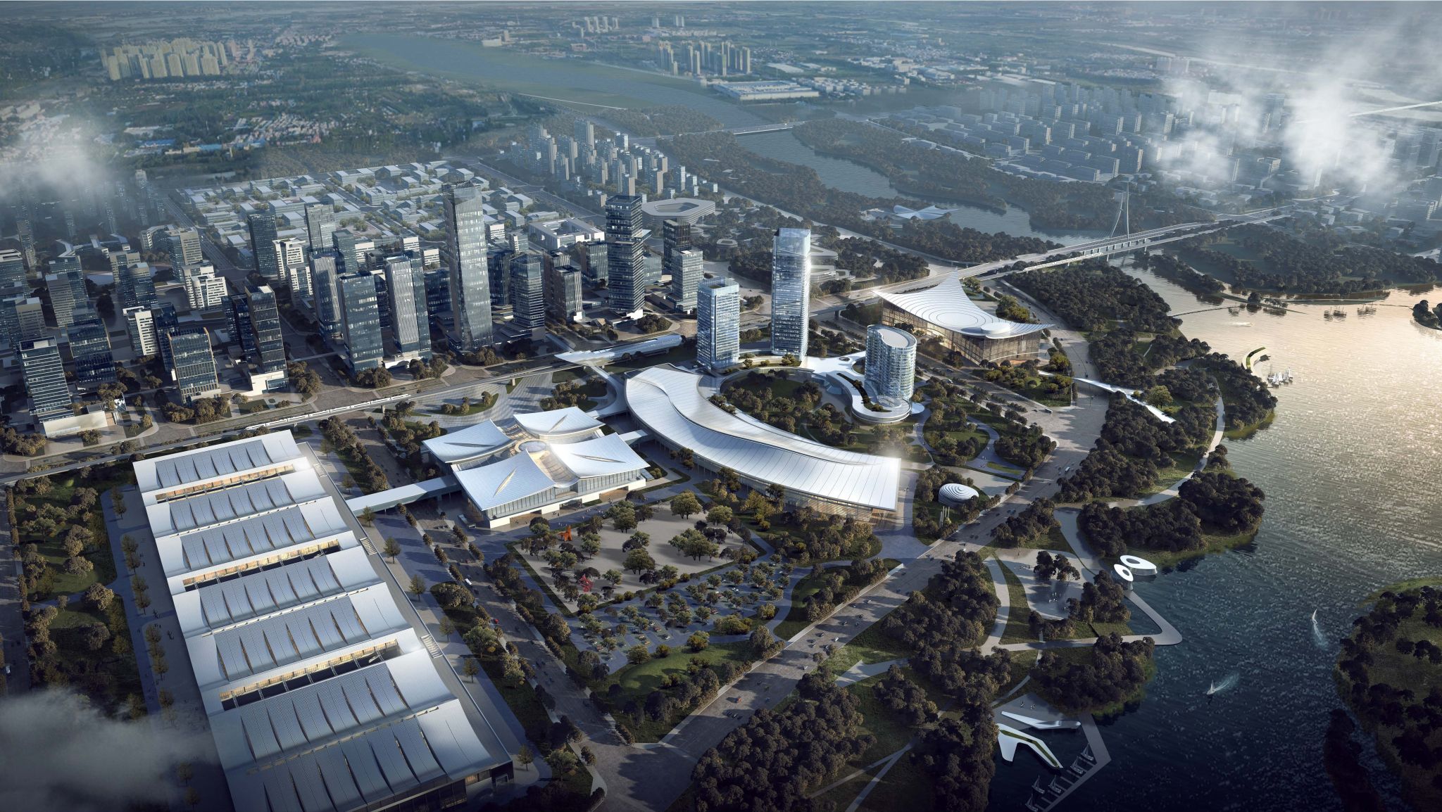 山西潇河国际会展中心北侧组团——钢框架、矩形钢管混凝土+下凹弧形倒三角空间钢桁架,装配率79%。